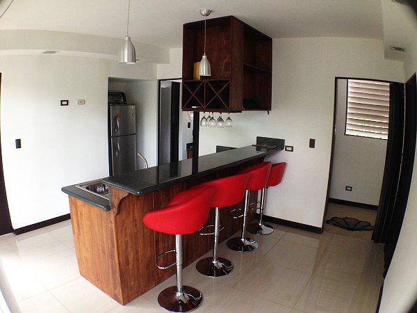 房子中部是公共煮食吧台,挂壁橱柜方面收纳节省空间。
