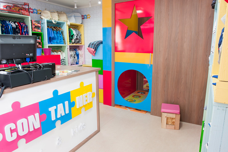 巴西的时尚儿童服装玩具连锁店--ConTAINER baby & kids彩色的店面装潢,简单明亮的氛围,加上集装箱风格的建筑,在同类的儿童用品店中别树一格。